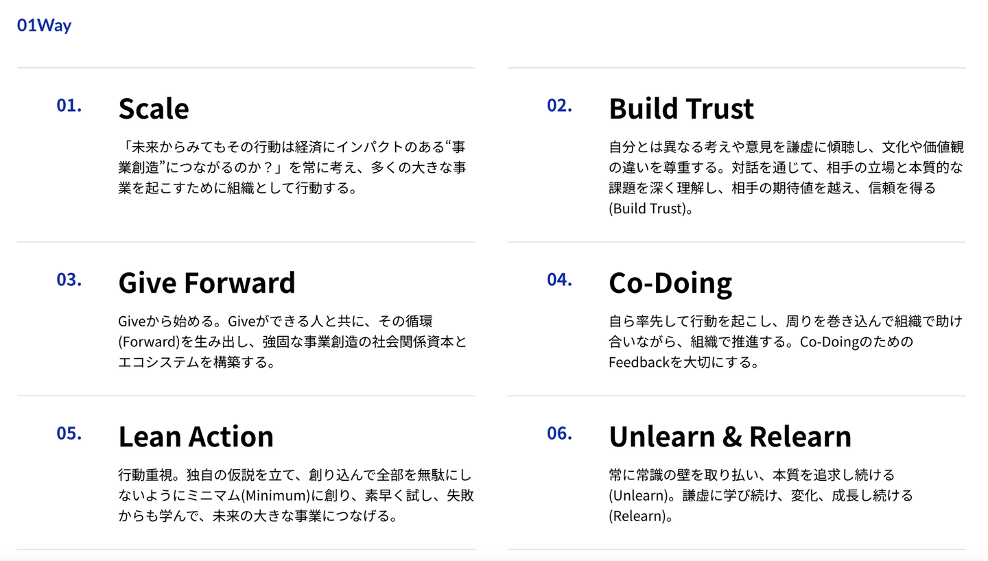 社内では、6つの行動指針「01Way」を共有し、これを体現したメンバーを称える制度「01STAR」が設けられています。
