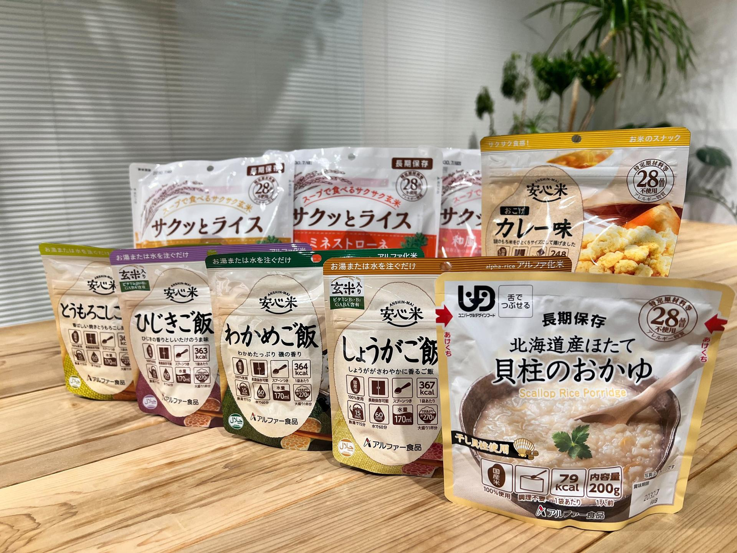 災害時に備え、約70食分の保存食を備蓄しています。アルファ米を使ったご飯やパスタなど、水だけで調理できる食品を揃えています。停電時や水が限られた状況でも安心です。