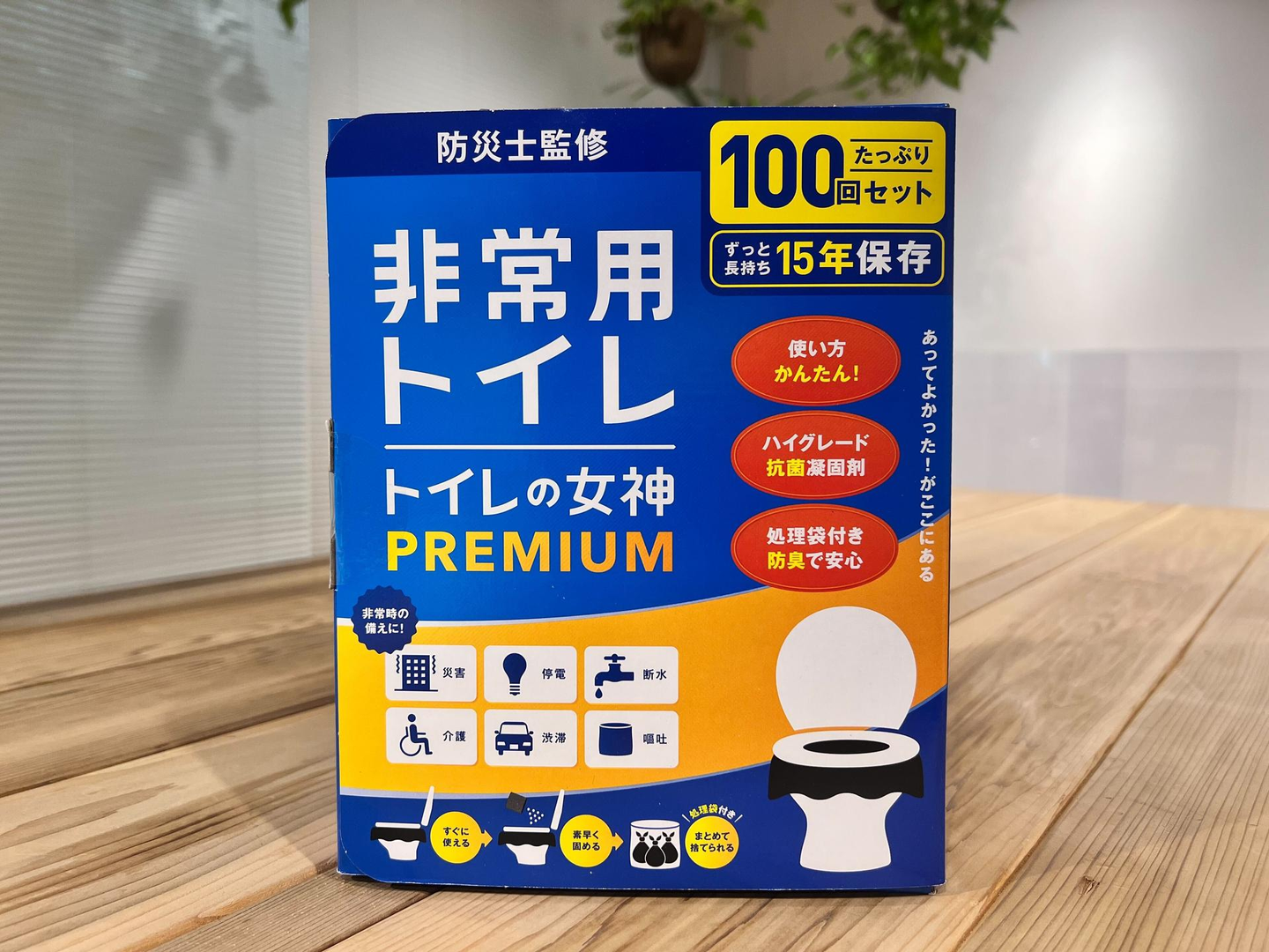 災害時に断水が続くと、トイレが使えなくなる可能性が非常に高いです。携帯トイレは、袋の中の凝固剤が排泄物をすぐに固める仕組みになっています。においを抑え、衛生的に処理できるため、避難所やオフィスでの待機時にも役に立ちます。ワンパクでは非常用トイレを100回分を備えています。