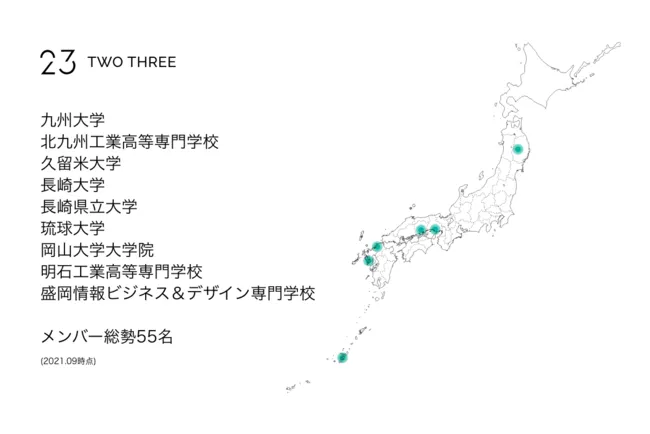 これまで多くのパートナーに支えられ、トゥースリーは急速に組織を拡大し、設立から1年でメンバー総勢55名を超えるまでになりました。北は岩手、南は沖縄まで、全国各地からクリエイティブスキルを持った学生クリエイターが集結し、デザイナーやエンジニア、事業開発メンバーがユニットとなり活動しています。
