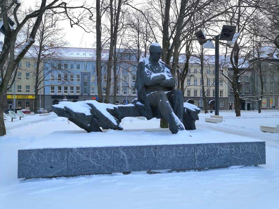 この像はエストニアの国民的作家 Anton Hansen Tammsaare の像で、エストニアの25クローン紙幣にも描かれていた人です。 クローンはエストニアがEU加盟前に使っていた通貨の単位です。