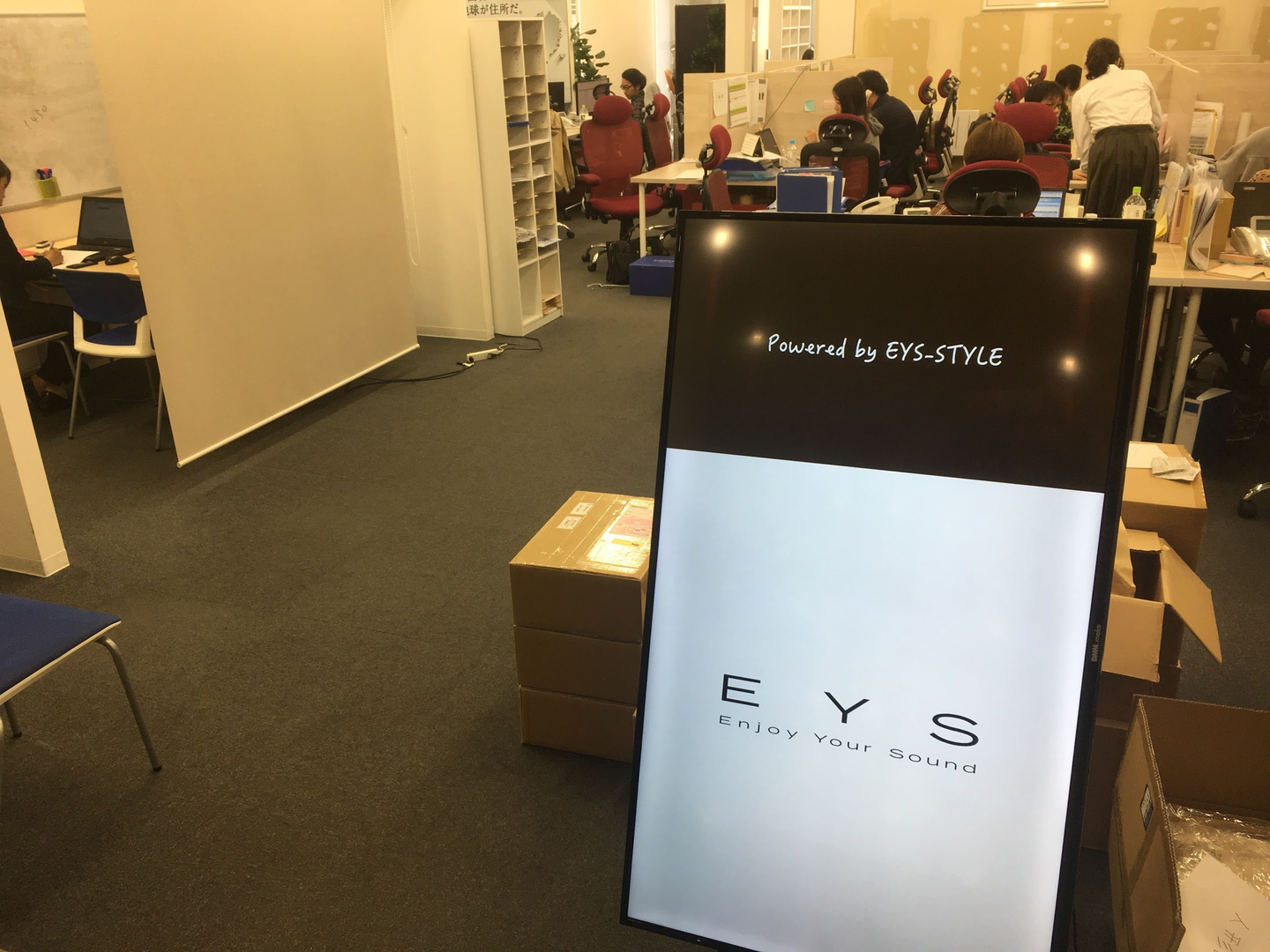現在は音楽教室のスタジオに設置予定のデジタルサイネージが置かれています。