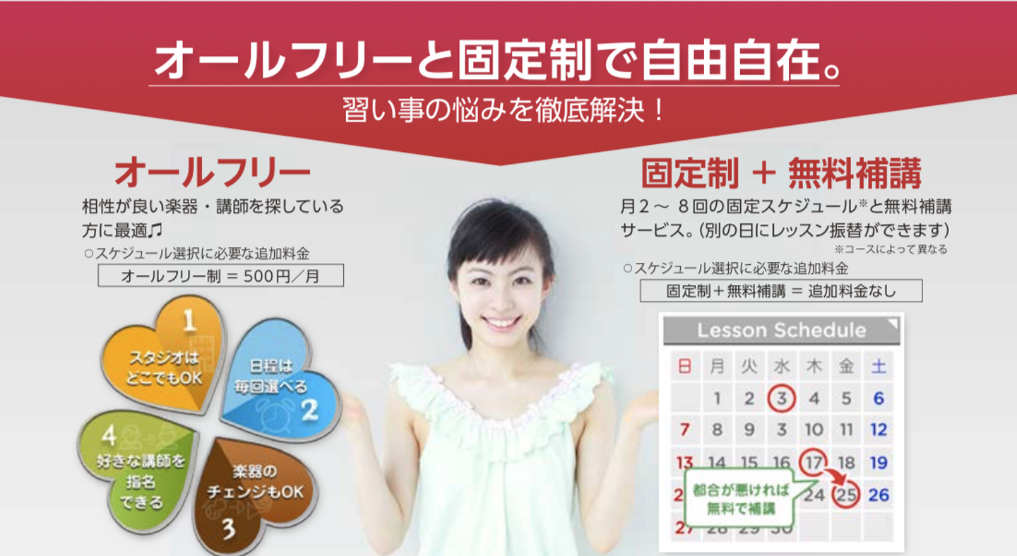 オールフリー制はスタジオ、講師、楽器が全て自由に選べる制度となっています。