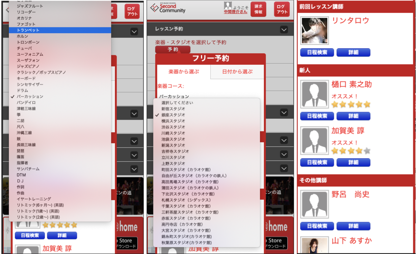 レッスン予約はSecondCommunityというコミニケーションツールを使っています。
