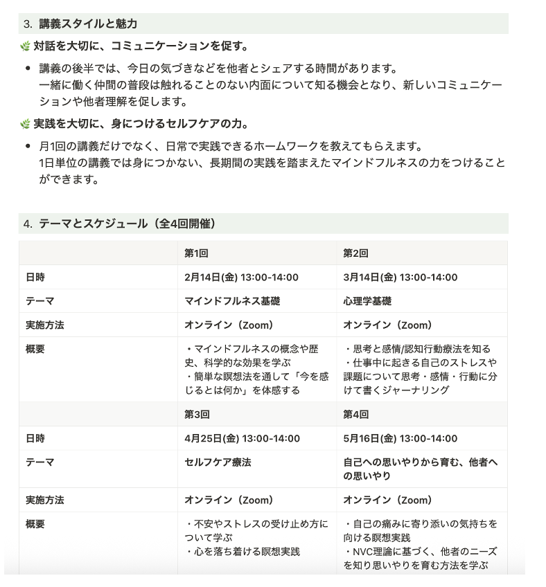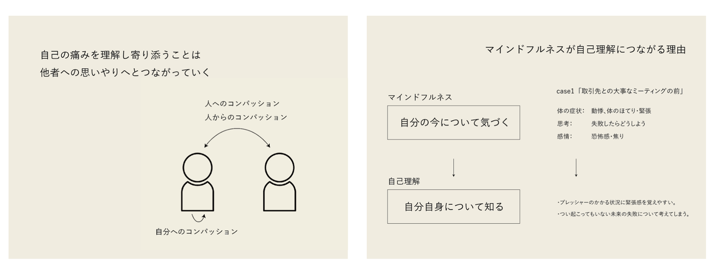 - 開催当時に社内で案内した資料の一部です。なるべくマインドフルネスを知らない人にもわかりやすく、日常で取り入れやすい講義になるよう工夫しました。また、参加者同士が言葉を交わせる時間を持つことも大切なポイントにしていました。