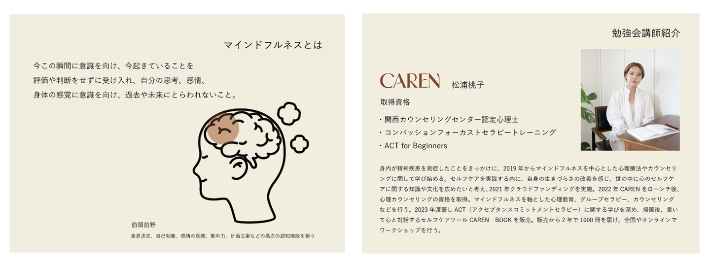 - 私自身の経験になるのですが、昨年に個人で講師の松浦先生が運営するスクールに通い、マインドフルネスについて学んでいました。この学びをきっかけにして、今の自分・そして過去の自分を深く知ることで、それまで目を背けていたような弱い部分にも上手に向き合うことができるようになり、以前よりも前向きに、日々を乗りこなせるようになれたと感じています。そしてその経験が、この勉強会の企画に繋がりました。