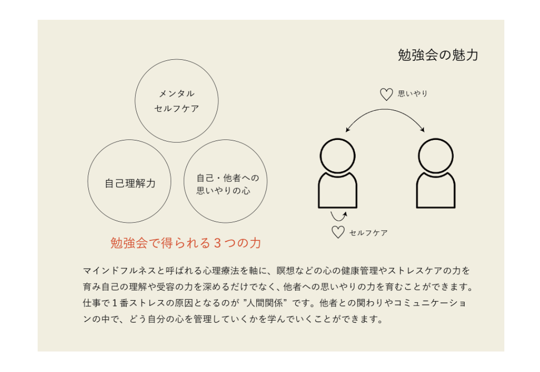 当社でも、自身のメンタルヘルスとの付き合い方、そして不調に対するケアの方法を知ることで、少しでも”人生の充実や幸せに暮らしていくこと”へ繋がってほしいという考えから、マインドフルネスを実践的に学べる勉強会を開催することになりました。