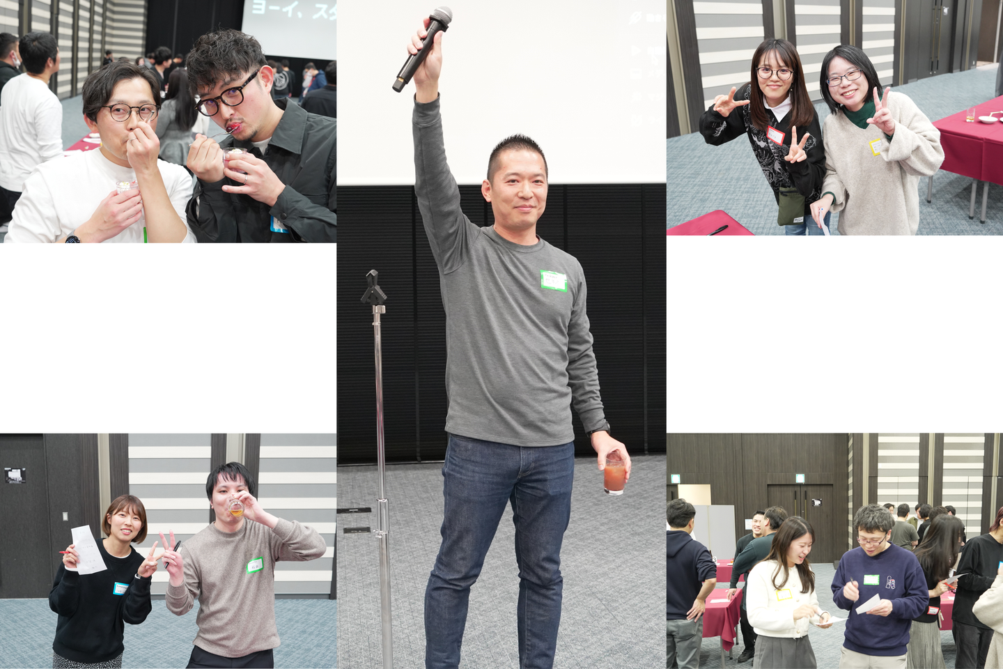 参加者一人ひとりに配布されたカードには、いくつかの質問が記載されており、会場内を自由に歩き回り、同じ回答をした人を見つけだすゲームです。 「好きな食べ物」「入社してで一番驚いたこと」「最近ハマっていること」など、様々な質問を通して、意外な共通点が見つかるたびに、参加者からは驚きや笑顔がこぼれていました。初対面の方とも自然と会話が生まれ、会場全体の一体感が高まりました。