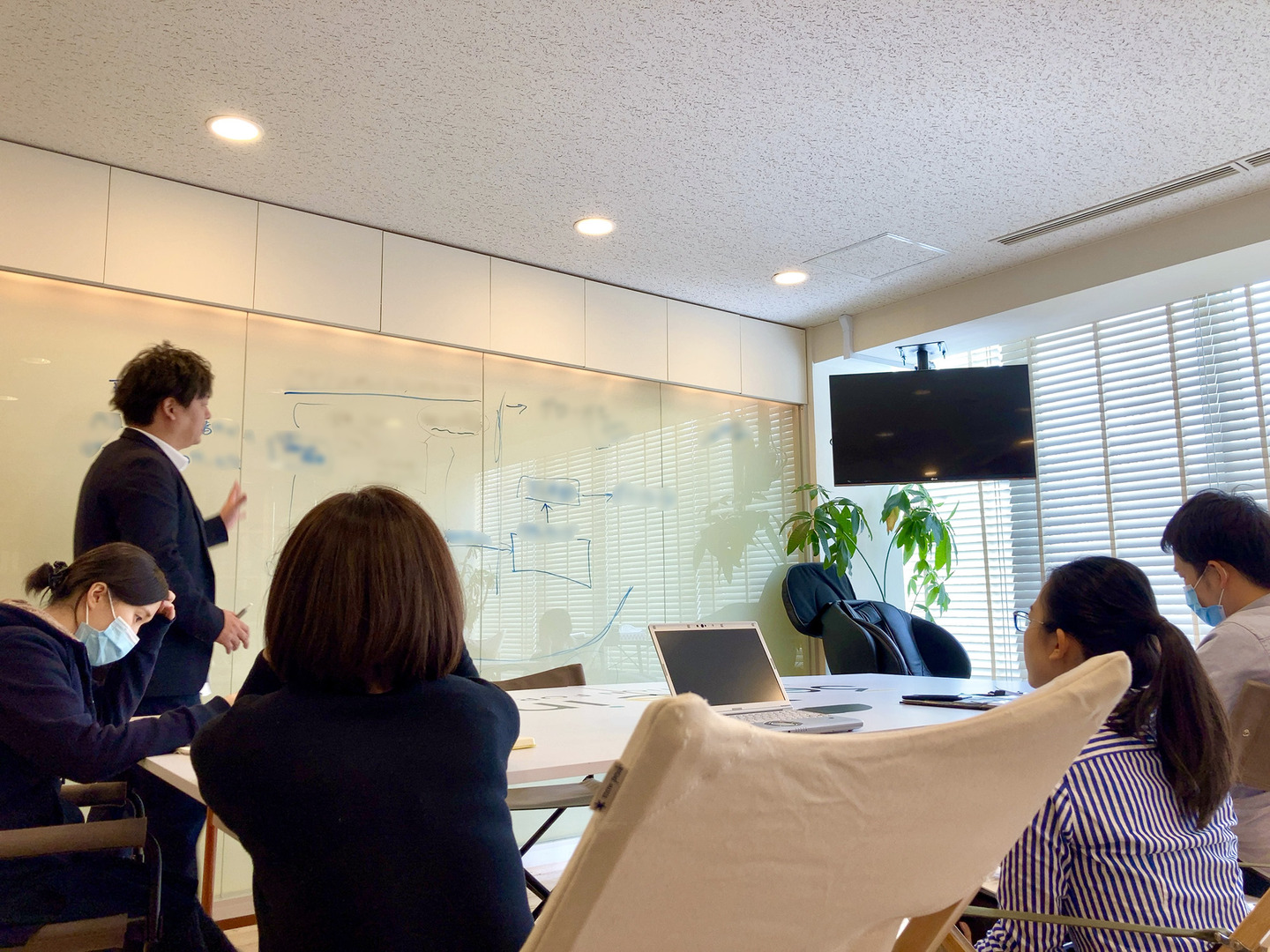 社長の頭の中をホワイトボードに書き起こして直々にスタッフへ説明。