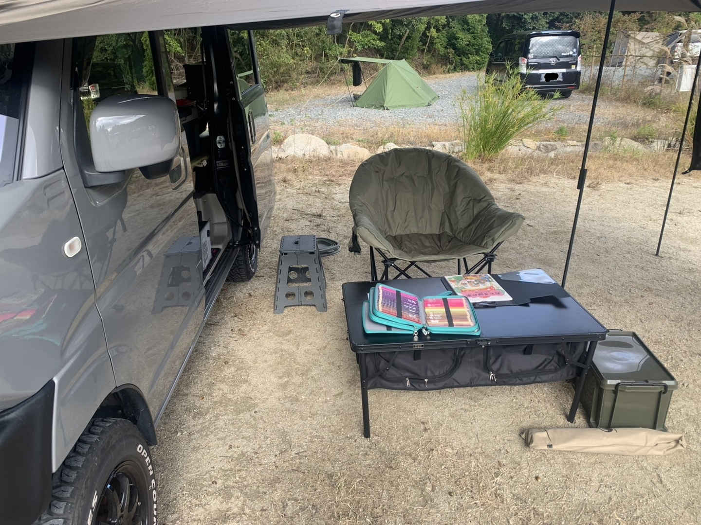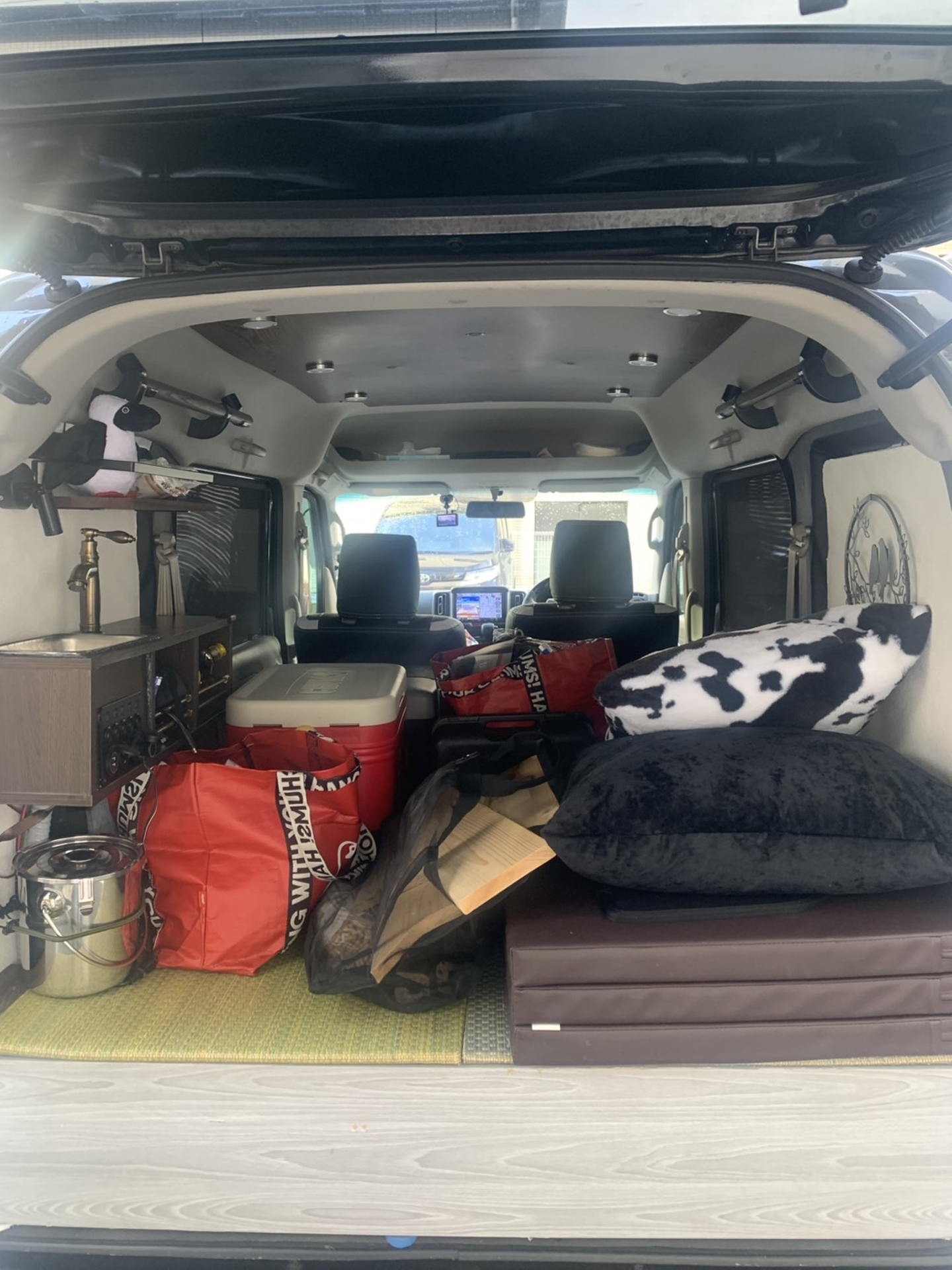 車内全面床下収納になっていて、後部座席もはずしたのでキャンプ道具はほぼ全て下に収納されています。上に乗せるのはクーラーボックスとか食器類、ランタンとかこまごましたものとかだけです。