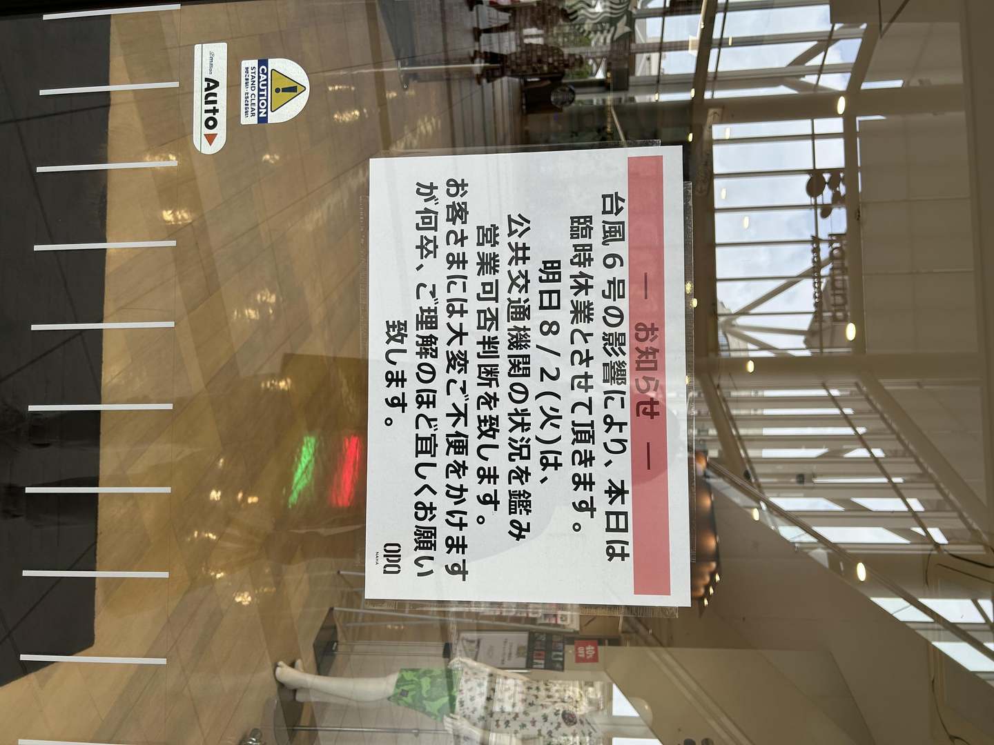で、台風ですが、さすがに8/1-8/2は暴風警報の発令中で、オフィスビルにある商業施設も休業となっていました。