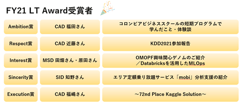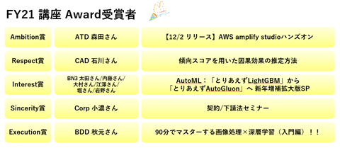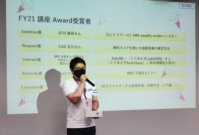その中でも【テーマ選び・内容の難易度・発表の仕方】が良く【ARISE analyticsのコアバリューであるAmbition・Respect・Interest・Sincerity・Executionと合致しているポイント】を受講者が評価し、上位5講座・5LTを表彰するのが 『AuT Award』です。