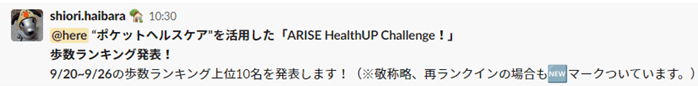 ARISE analyticsが開発支援したヘルスケアアプリを活用し、毎週歩数ランキングをSlackで通知し、期間中の上位3名にヘルスケア景品を贈るイベントを実施しました。(景品は低糖質なBASE BREADシリーズのおやつや、高たんぱくのカップヌードルセット、サラダチキンセットやスマートウォッチなど‥!)