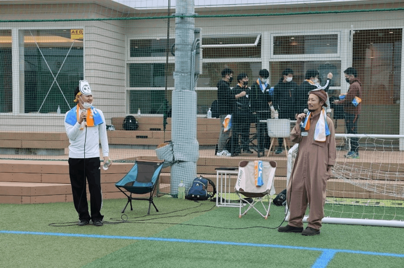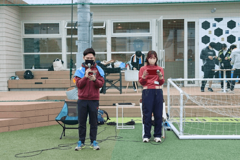 社内のSDGs推進事務局による、SDGs漫談タイム。実はこのARISE運動会でも配布するペットボトルをラベルレスにしたり、飲食物のロスを減らすために最低限の発注に留めたりするなど工夫しました。