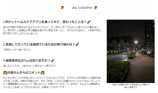 👆社内報に上位ランクインする社員へのインタビューも掲載。健康習慣化の面白いTipsも幾つかあり、盛り上がりました。