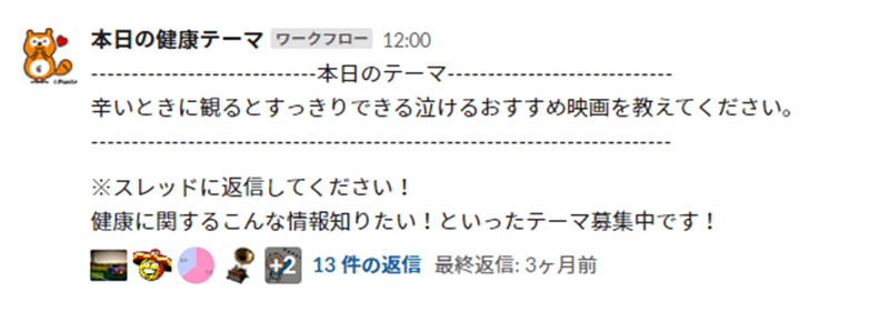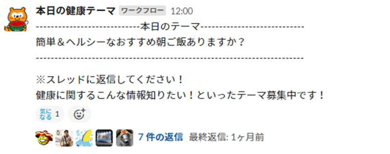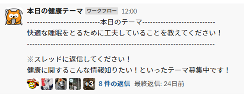 全社員が入っている健康経営用のSlackチャンネルに「健康テーマ」botが流れ、スレッドで回答する取り組みも。様々なテーマを織り交ぜながら、可愛らしいアイコンで展開しています。