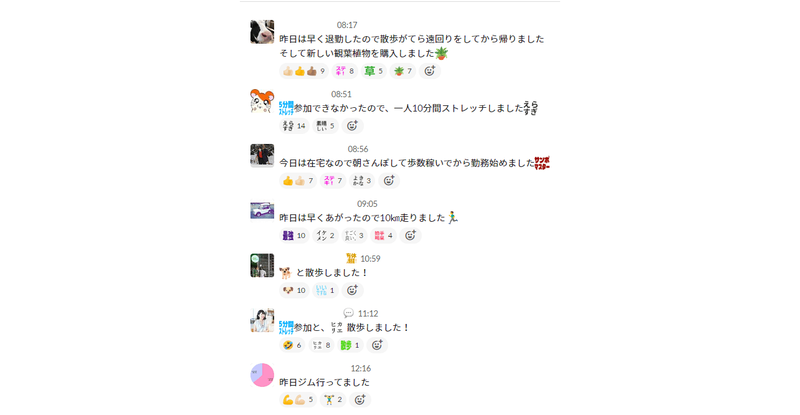 Slackで「健康なことをしたら褒めるチャンネル」を作り、社員が健康に良いことをしたら自主的に書いていく!といういたって単純な(?)チャンネルですが盛り上がりを見せ、毎日誰かしらがつぶやいていました。