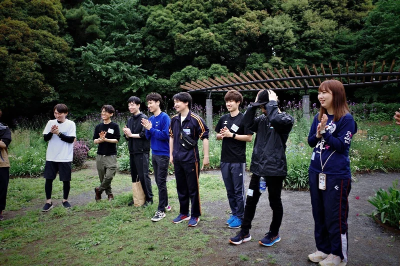 その後、「ゆるっとチーム」「頑張るチーム」に分かれて、自己紹介をして円陣を組み気合いを入れて、いざ出発!