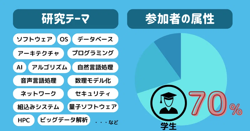 情報処理学会とは、コンピューターを中心とした情報処理に関する技術を扱う学会のことです。中でも大きなイベントである全国大会では、学生さんの参加比率が高く、参加者約4500人のうち7割を占めます(2023年実績)。