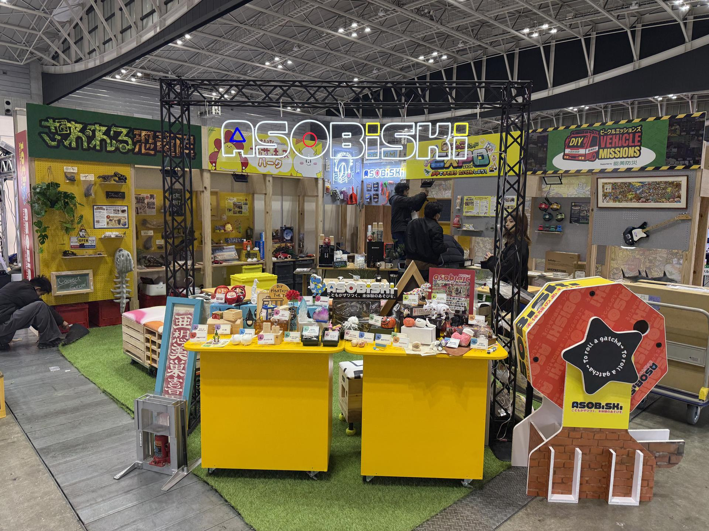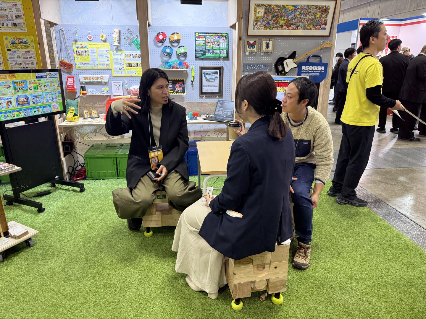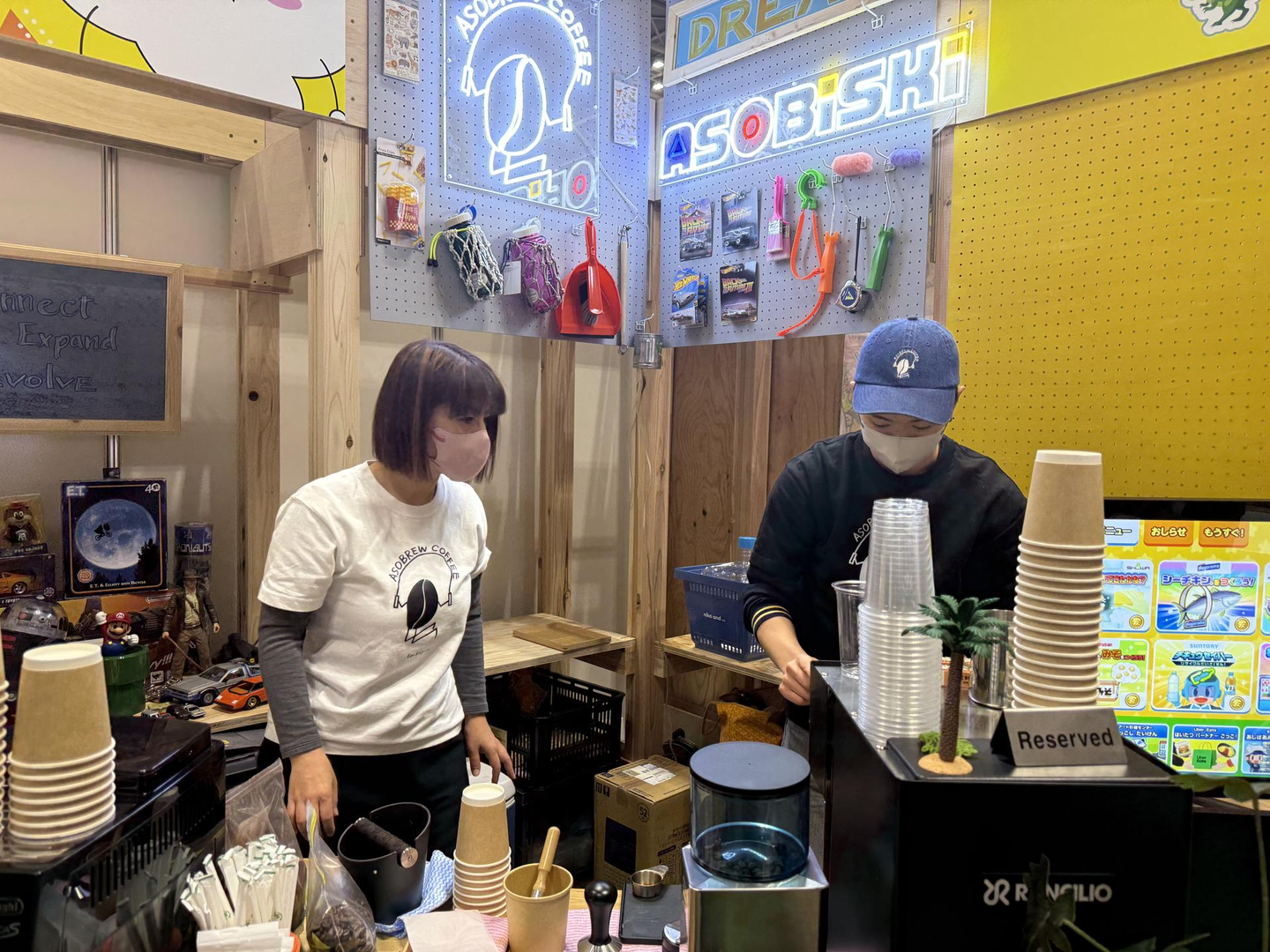 昨年まではブースにぎっちりコンテンツを詰め込んで足の踏み場もないくらいの情報量が売り、みたいなブースにしていましたが、今年は壁面に情報を集中してブース内を広く取り、商談テーブルを配置、更には昨年OPENしたカフェ【ASOBREWCOFFEE】の出張カフェをオープンして皆様へ美味しいカフェラテをお楽しみいただきました。