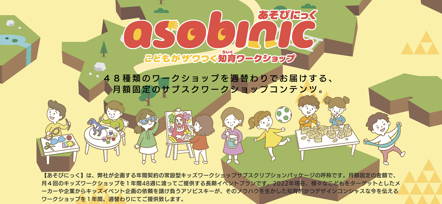 私達(株)アソビスキーは、「子どもがざわつく、未体験な遊びを。」を合言葉に、ひらめきや新しい気づきを与えることをテーマとしたイベントワークショップを企画運営しています。