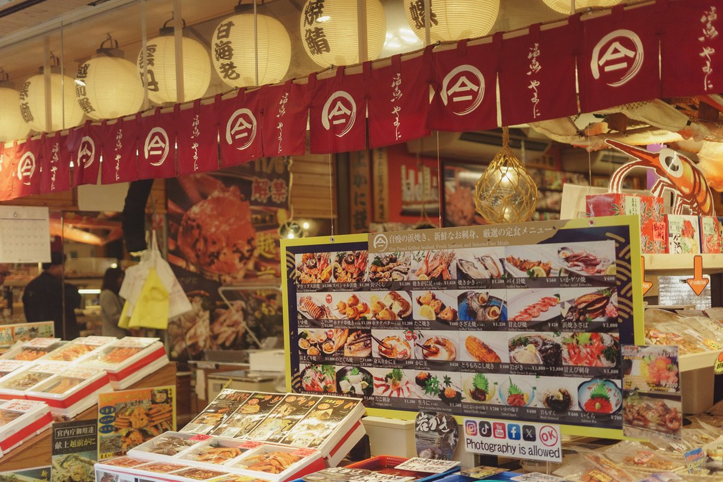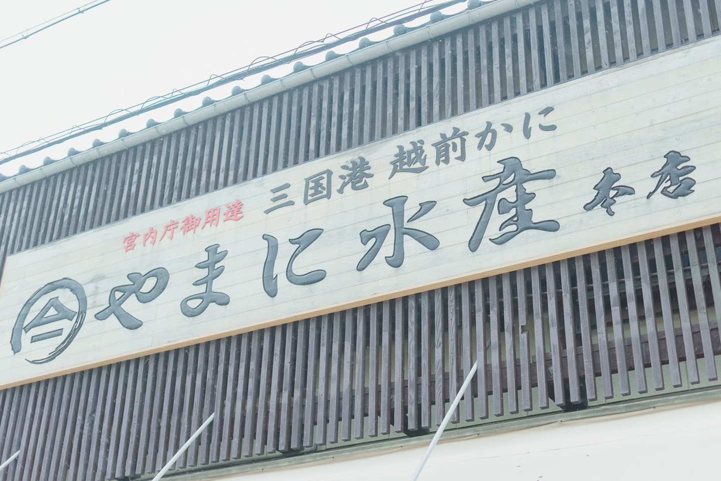 雨が強くなってきたので東尋坊もそこそこにカニの店へ避難。東尋坊から歩いて2−3分で、ここはみんなセットで観光する感じなんですよねぇ。流れができている。さあお待ちかねのやまに水産さんです。宮内庁御用達、かなり期待がありあまり漏れ出しているなか、伝統を格式を感じる看板の下を潜っていきます。
