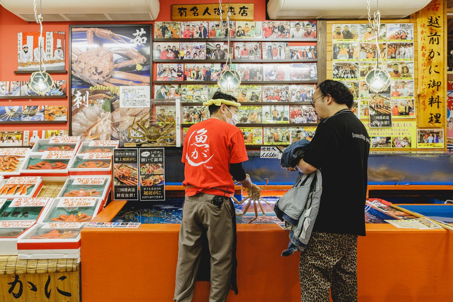 私もカニについて店員さんと談義。越前ガニについて聞いてます。