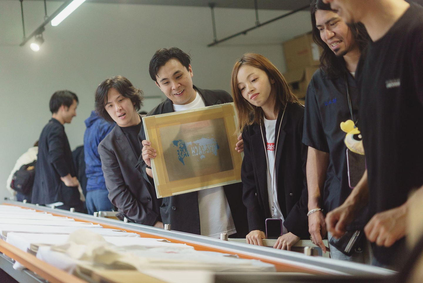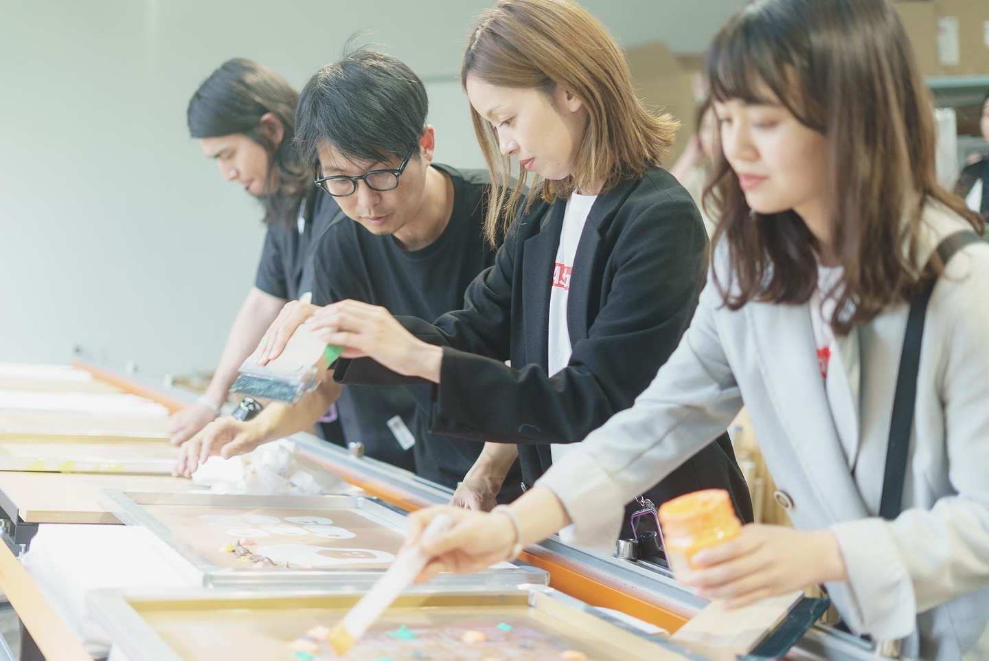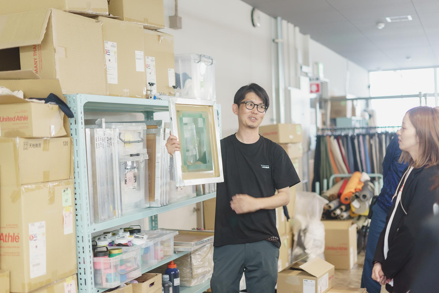 レクチャーを受けた後、今日は社員の希望でシルクスクリーンをつかってオリジナルTシャツをつくる体験をさせていただきました。今から自由に選んだ柄のTシャツを作っていきます。