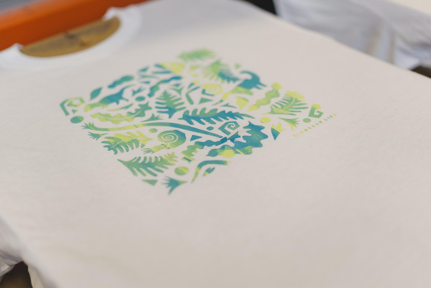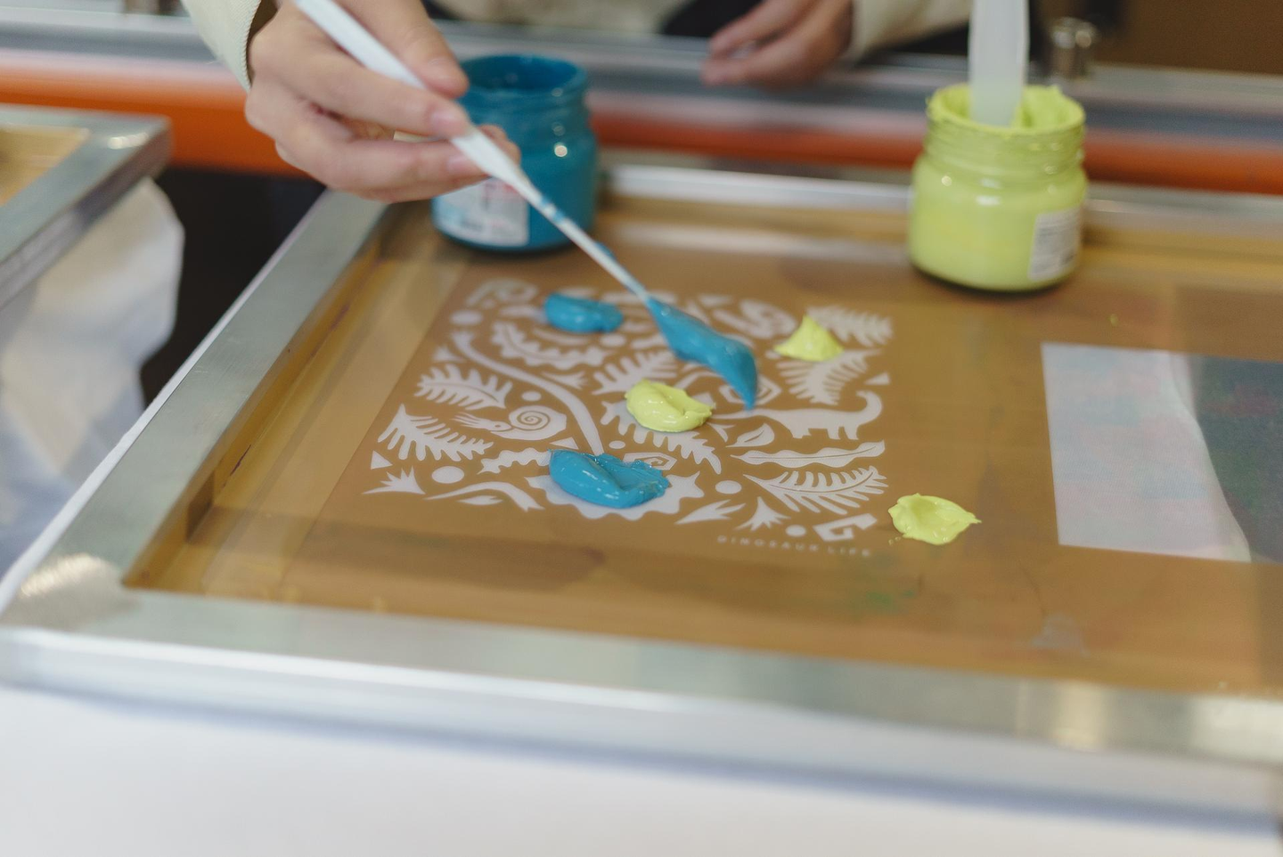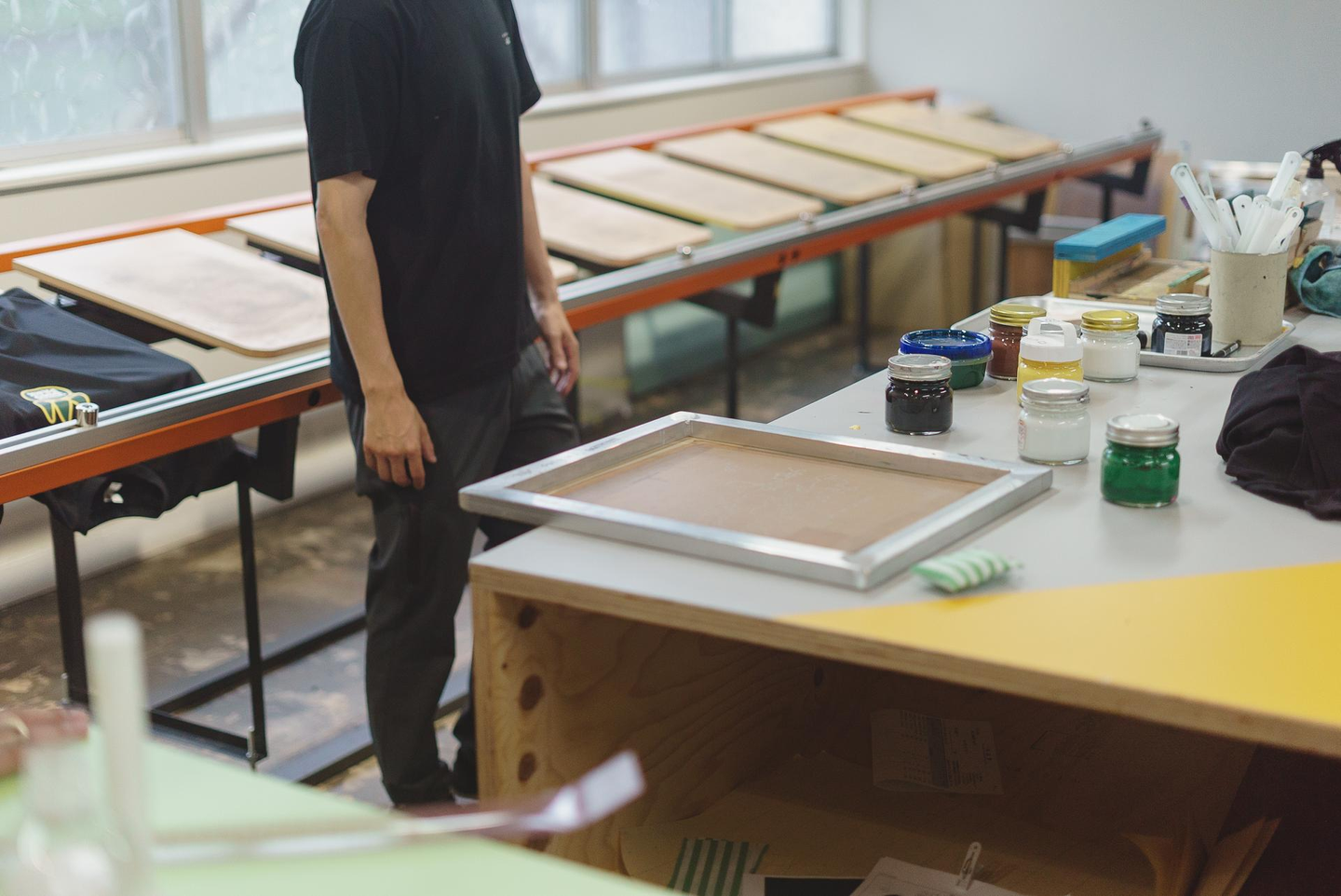 レクチャーを受けた後、今日は社員の希望でシルクスクリーンをつかってオリジナルTシャツをつくる体験をさせていただきました。今から自由に選んだ柄のTシャツを作っていきます。