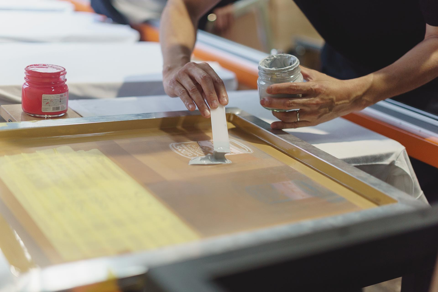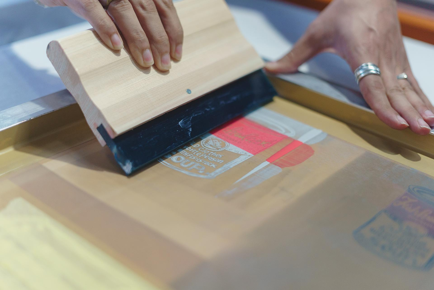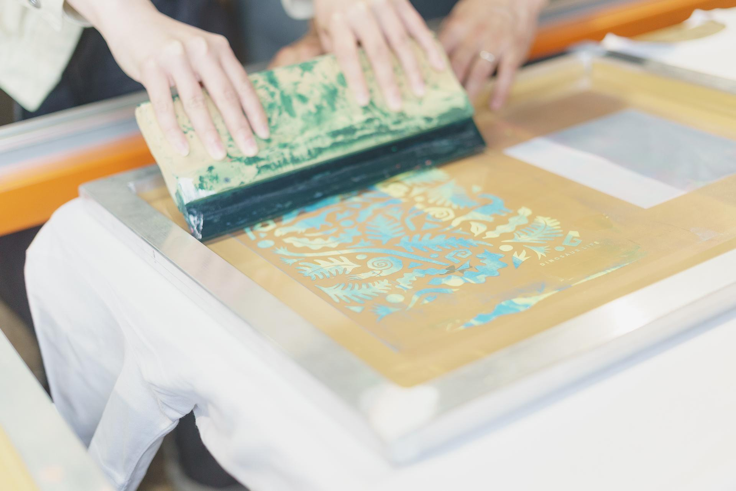 そしてゴムベラで一気にスクリーンの模様の上をなぞって潰しながらインクをのせていきます。