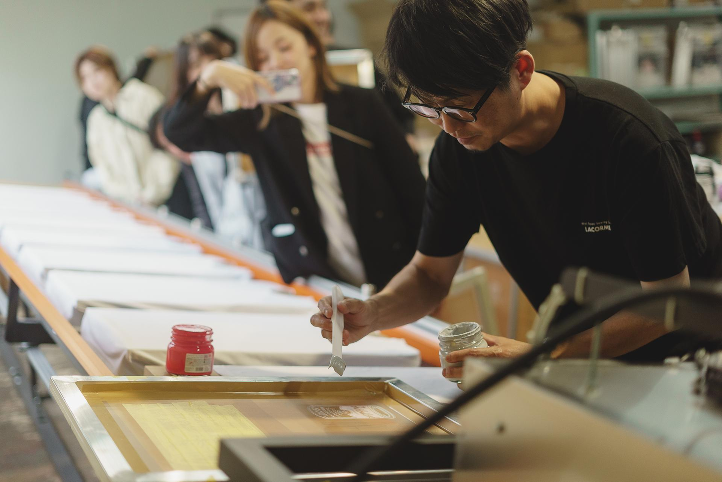 織田社長直々のインクのせ実践を視察。好きなカラーを選んでヘラでインクを横にのせていきます。