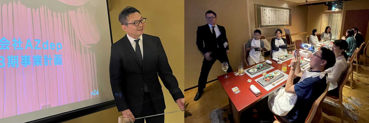 豪華な食事を愉しみながら、スタッフは今期のテーマと目標を共有。新しく始まる一年で、さらにAZdepが発展できるようお互いの士気を高めます。
