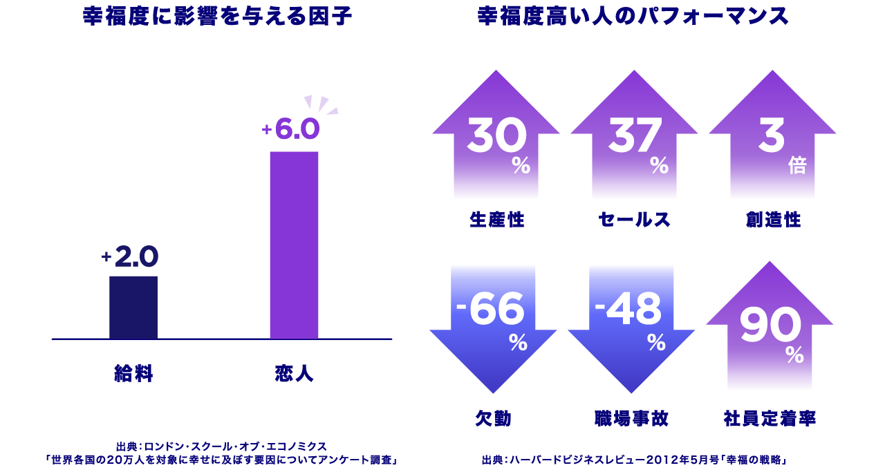 各調査結果では、かけがえのないパートナーの存在は幸福度を高め、社員のパフォーマンス向上に繋がる重要なファクターとなることがわかっています。つまり、働く人のWell-beingにはワークライフシナジー(仕事と私生活の相乗効果)が欠かせない要素です。