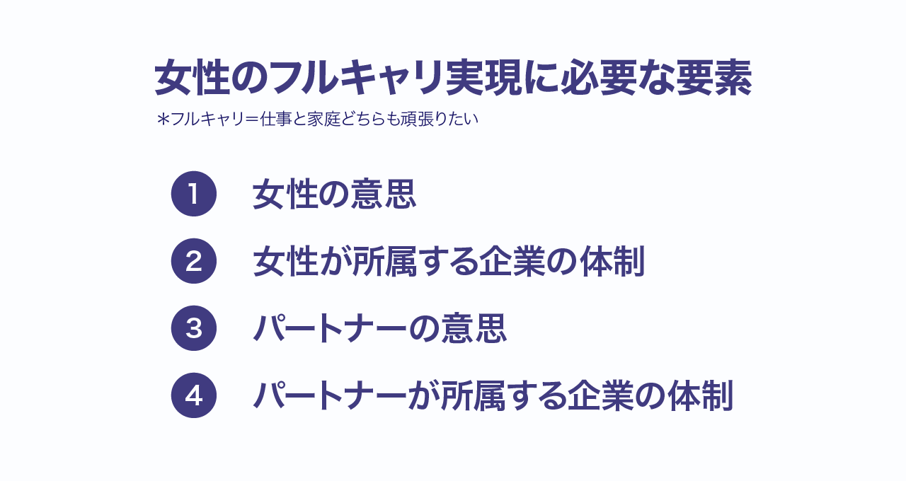 一方、かねてより「企業が社員のライフにおける心の健康と幸福感をサポートすることは難しい」という課題がありました。同時に、ダイバーシティ・インクルージョンのためには女性活躍推進が重要であるにも関わらず、女性側の企業だけではワークと家庭の充実(フルキャリ)に必要な要素を満たすのが難しい現実があります。