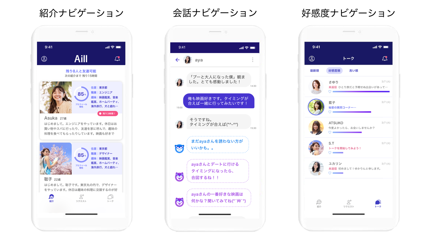 紹介ナビゲーション、会話ナビゲーション、好感度ナビゲーションという3つのAIナビゲーション機能によって、男女のコミュニケーションのすれ違いを緩和します。さらに自分では直接言いづらいこともAIが自然と代弁するなど、共通の友達の役割も担います。