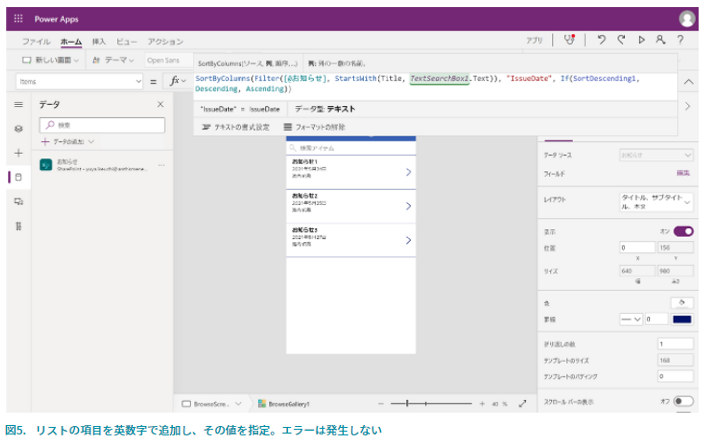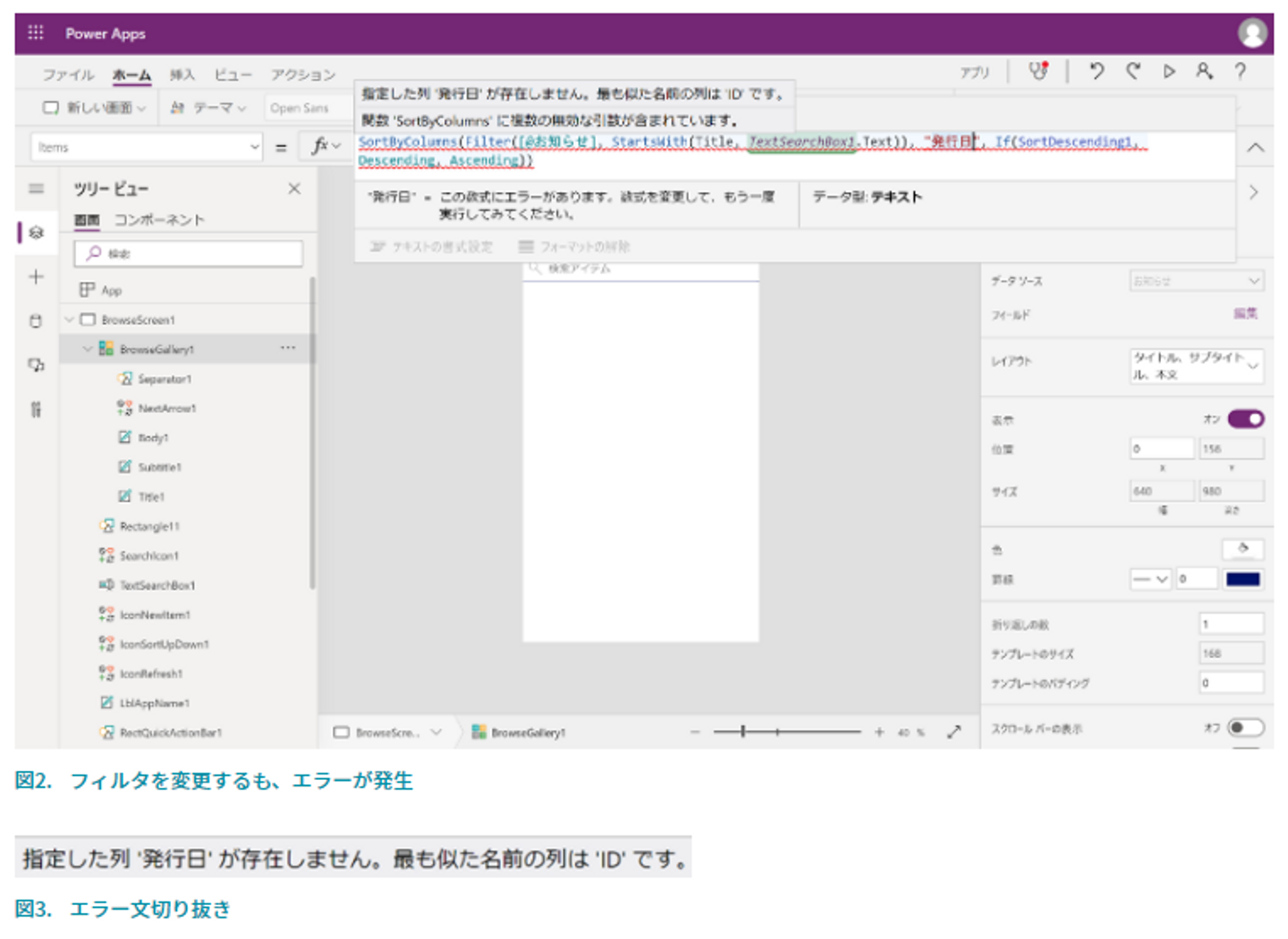 今回は、SortByColumns関数を使い、ソート順を[タイトル]順から[発行日]順に変更するケースについて考えます。