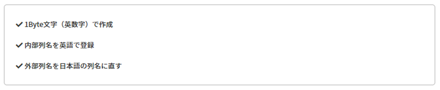 ※内部列名は後から変更できないので、最初から1Byte文字で作成することが重要です。
