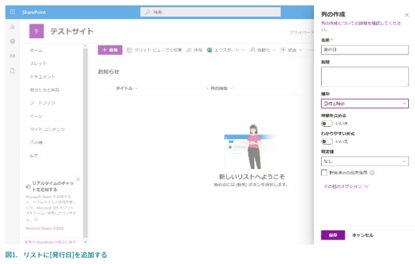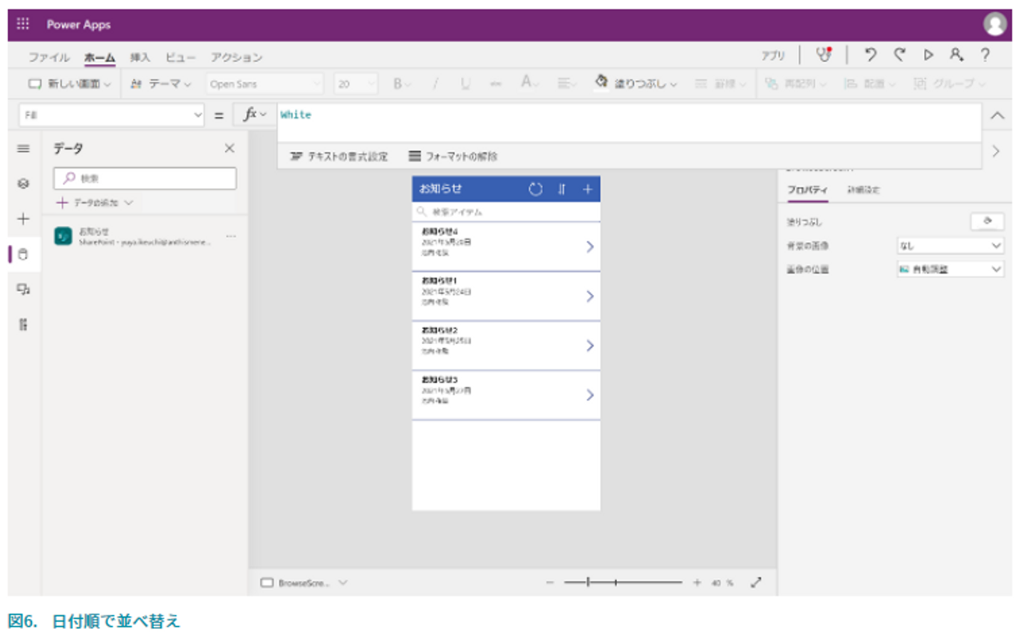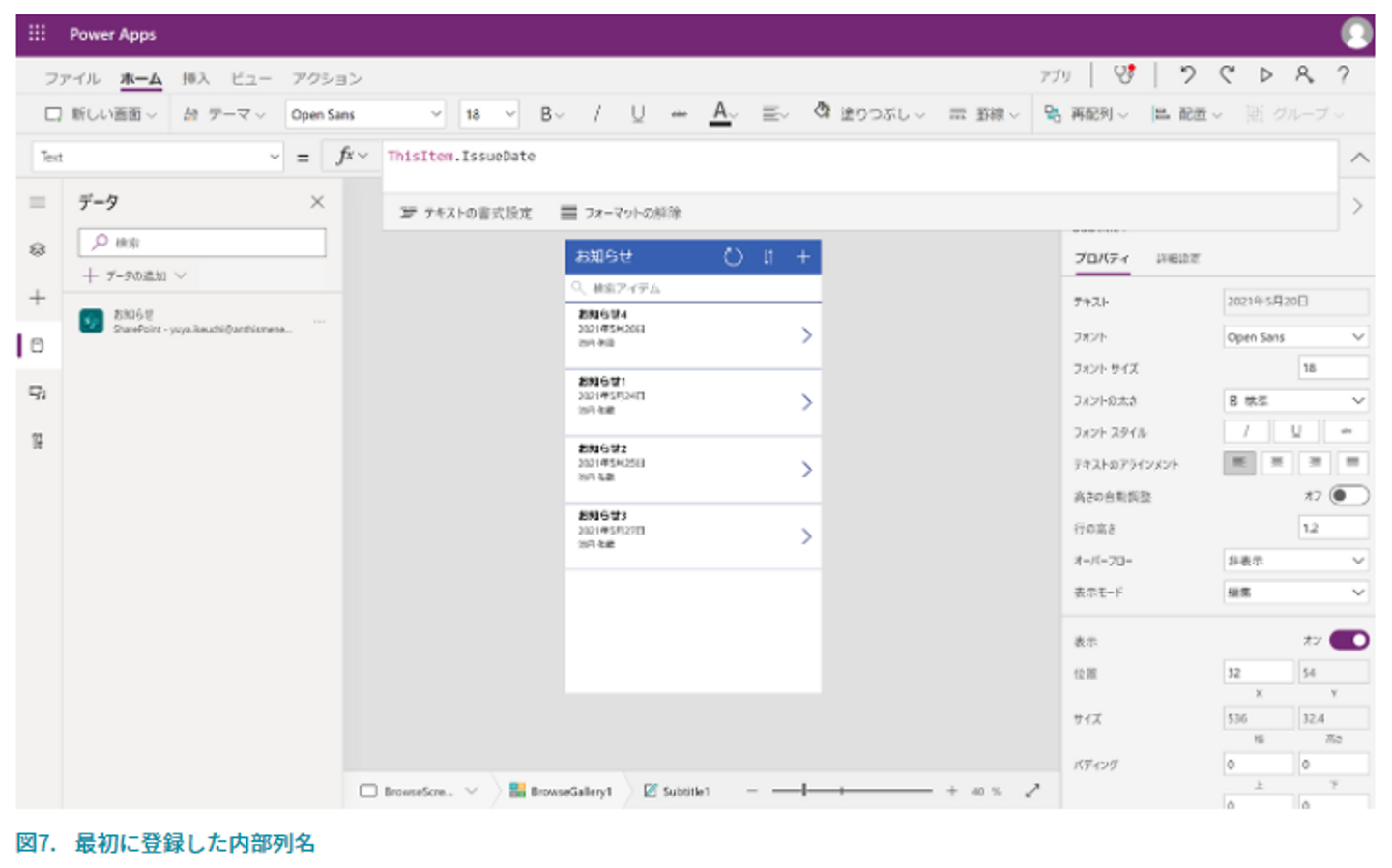 まず、SharePoint標準のリストに[発行日]という列を追加し、Power Apps にてリストをデータソースとして指定したアプリを作成します(図1)。