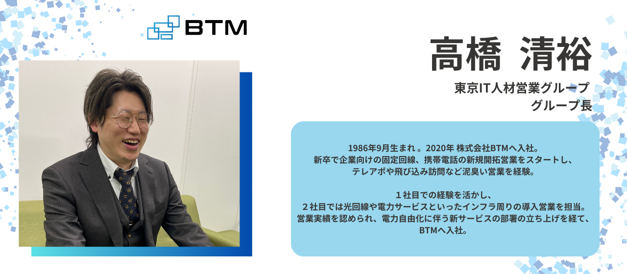 高橋さんの営業としての強い意志と、ご自身の経験を活かしてメンバーを育てようとする戦略的な組織づくりへの想いは、BTMのValueでもある、「打って出る」の体現であり、会社会社全体の成長に良い影響を与えていると改めて感じています。
