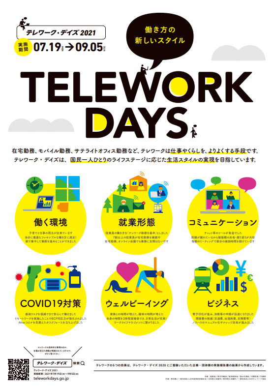 総務省、厚生労働省、経済産業省、国土交通省、内閣官房、内閣府では、東京都および関係団体と連携し、柔軟な働き方を実現するテレワークの全国的な推進と、2020年東京オリンピック・パラリンピック競技大会の交通混雑緩和、および新型コロナウイルス感染拡大の防止に寄与するよう「テレワーク・デイズ2021」を実施します。 テレワークデイズ2021実施期間 ...
