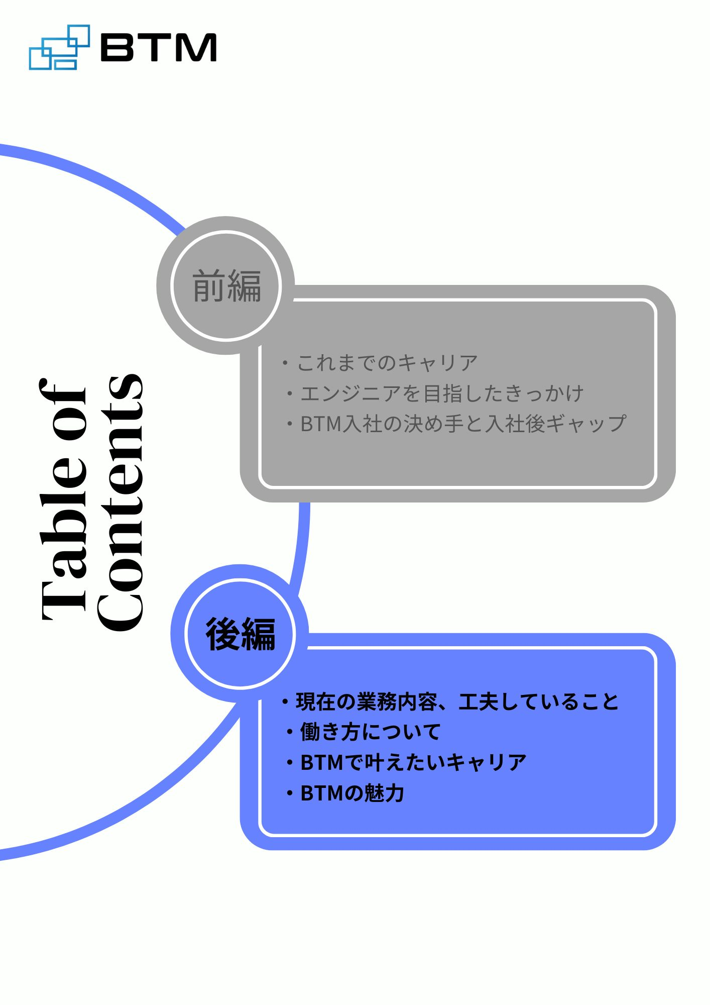 こんにちは!株式会社BTM 採用担当の日髙です。先日、SESエンジニアである古本さんのインタビューを投稿しましたが、引き続きシリーズ化してお届けしていきたいと思います☆▼古本さんインタビュー記事...