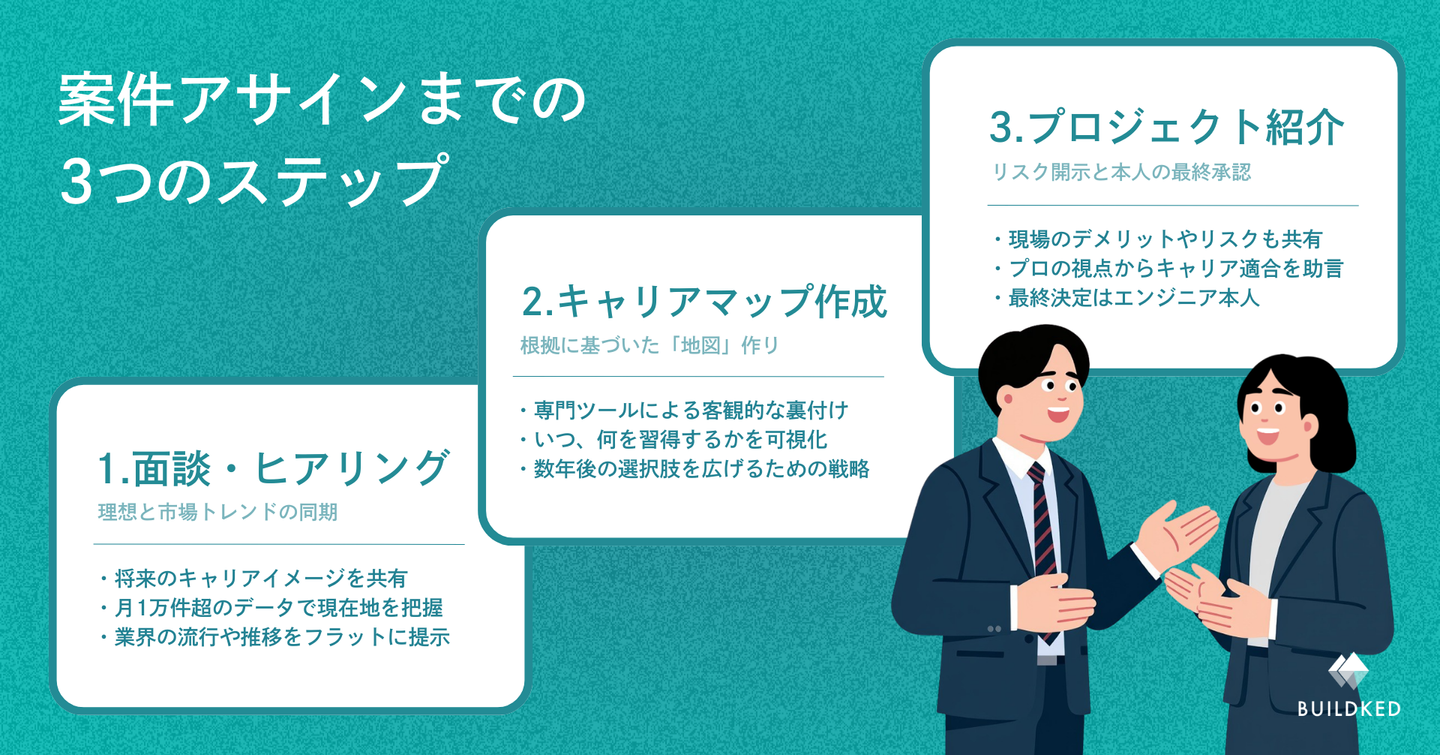 「とりあえず参画できそうな案件を紹介する」ようなことはしません。参画前に以下のステップを踏み、エンジニアと認識を完全に同期させます。