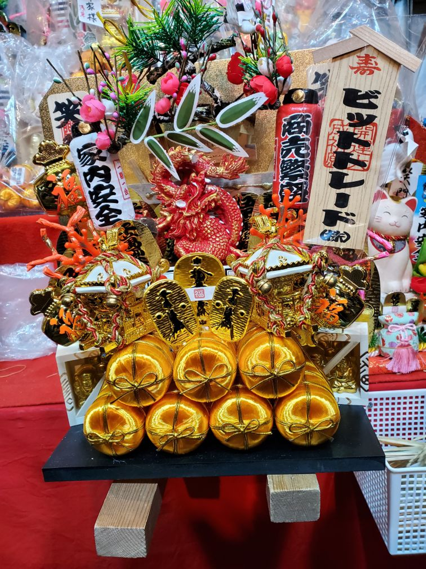 今年は龍の装飾が施された豪華絢爛な熊手を購入。昇り龍効果で運気もアップ!
