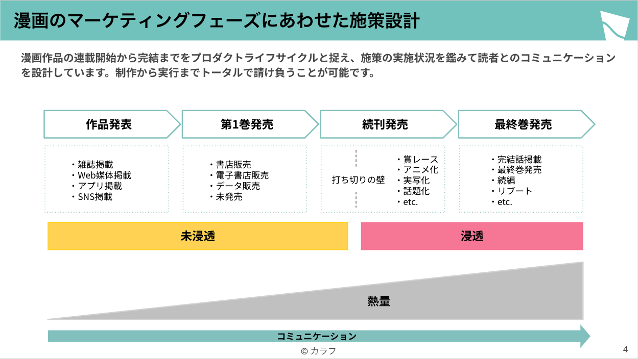 以下は、漫画作品と関わる上で弊社が最初にお話させていただく内容です。産声をあげたばかりの漫画作品と、完結を迎え熱量が高まっている作品では当然やるべきことは変わってきます。作品一つ一つと向き合うこと。まずはその姿勢からだと思います。