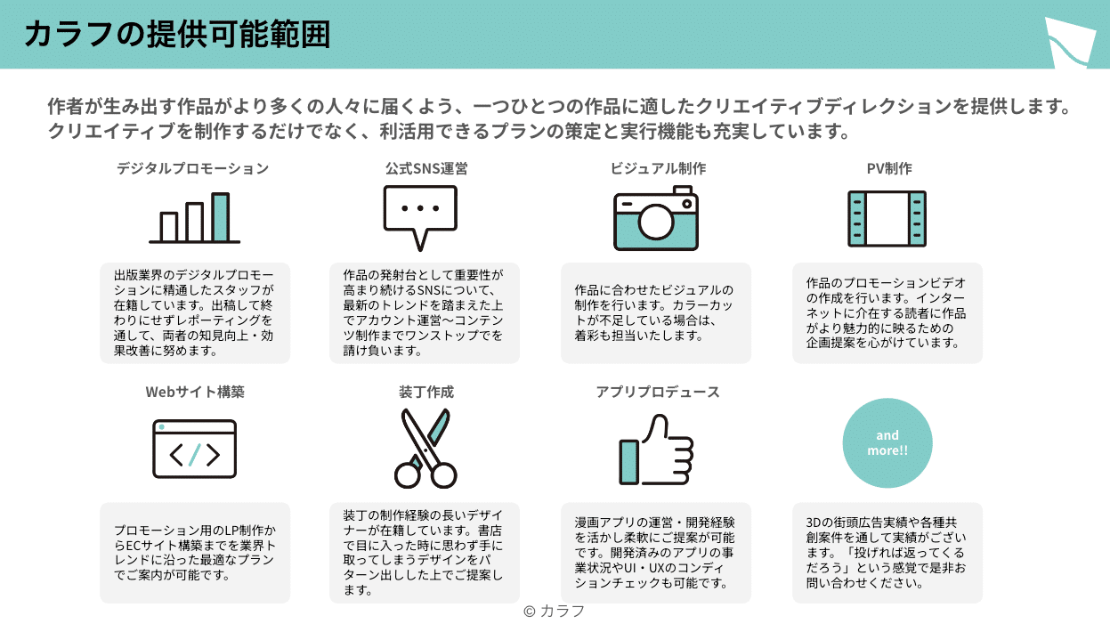 弊社の事業は「創作物と関わること」のみに絞って展開しています。