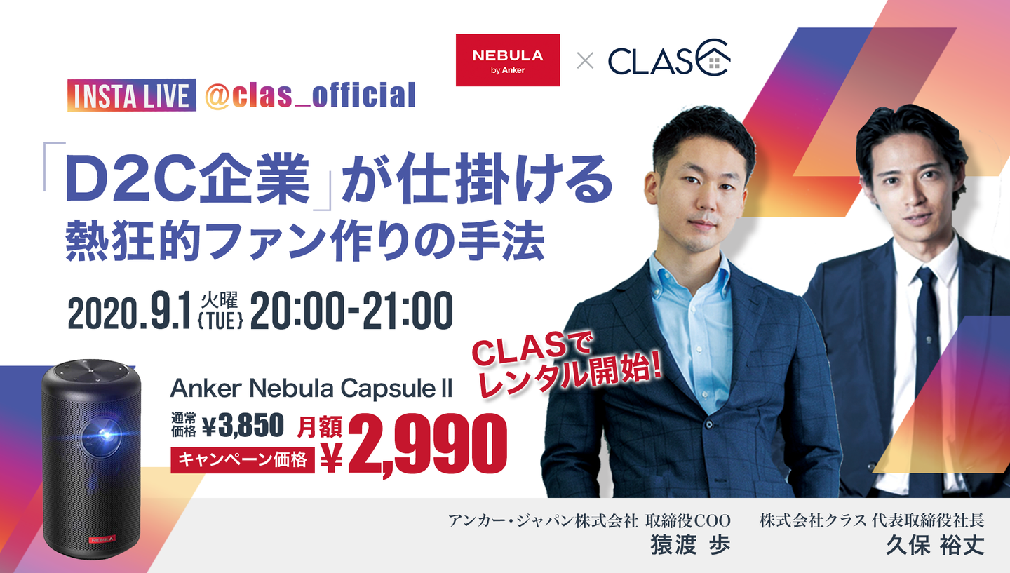 そのご縁から、9月1日(火) 20:00~CLASオフィシャルInstagram(@clas_official)にて、2020年8月にアンカー・ジャパン株式会社 取締役COOに就任された猿渡 歩(えんど あゆむ)氏と久保の対談を中心とした、インスタライブ『「D2C企業」が仕掛ける熱狂的ファン作りの手法』を開催します!