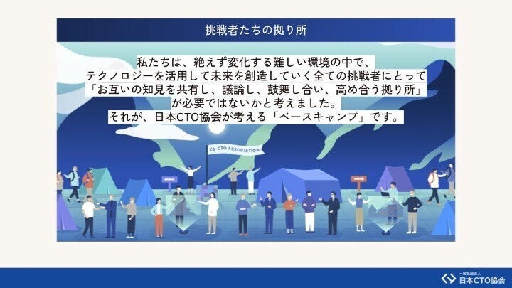 我々は、上記の方針を満たしたコミュニティを「ベースキャンプ」と呼ぶことにしました。本来、ベースキャンプとは「必要物資を集め、登山を開始する拠点となるキャンプ」のことを指します。それを日本CTO協会に置き換えると、ベースキャンプとは「必要な情報を共有し、議論し、鼓舞し合い、お互いを高め合う場所」のことを指します。「それぞれのCTOが掲げる目標」こそが目指す山であり、その山をよりうまく登るために日本CTO協会が存在するのです。
