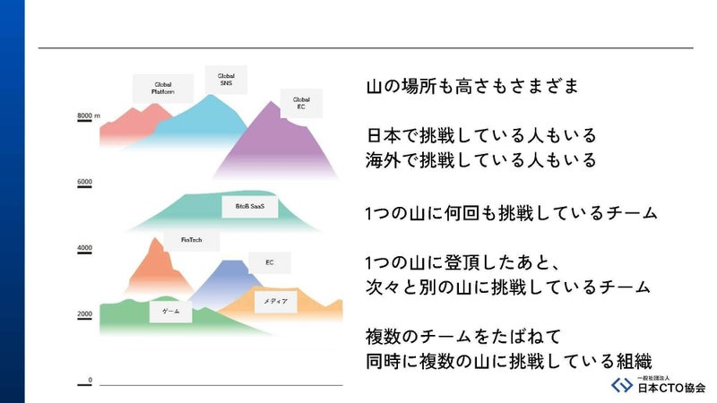 世の中には色んなCTOがいて、目指す山(目標)もさまざま。外からは順調に見える組織も、常に困難な状況があり、悩みを抱えている個人やチーム、企業は多いです。だからこそ、ある組織が困難を乗り越えた経験は、同じ困難を抱えた他の組織を救えると信じています。