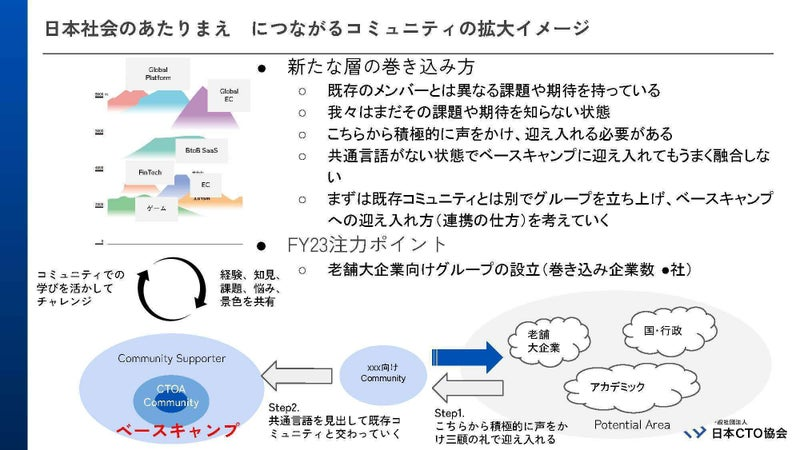 コミュニティを更に大きくするには、新たな層の巻き込み方を考える必要があります。世の中の企業やCTOは、既存メンバーとは異なる課題を持っていますが、我々はまだその課題を知りません。だから、新たな個人やチームが入りにくい状況になっているんじゃないかと思っています。もっと気軽に参加しやすい雰囲気を作るためにも、こちらから積極的に声をかけ迎え入れる必要があるのです。
