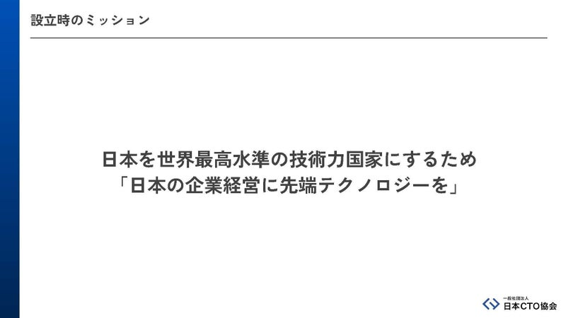 そこで、CTOの悩みを共有する公なハコとして、理事11名で日本CTO協会を立ち上げました。その当時のミッションがこちらです。